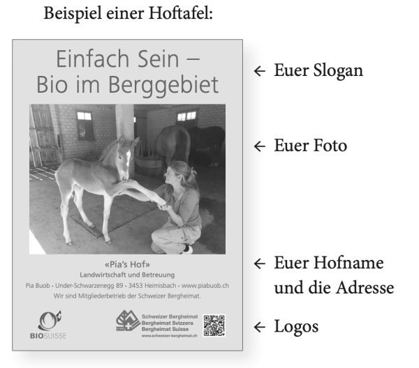 Der Vorstand der Schweizer Bergheimat bietet den Bergheimat-Höfen noch einmal die Möglichkeit, Hoftafeln anfertigen zulassen. Diese sollen interessierte Menschen auf die Arbeit und Bio-Produkte aufmerksam machen und natürlich auf die Mitgliedschaft bei der Schweizer Bergheimat hinweisen.